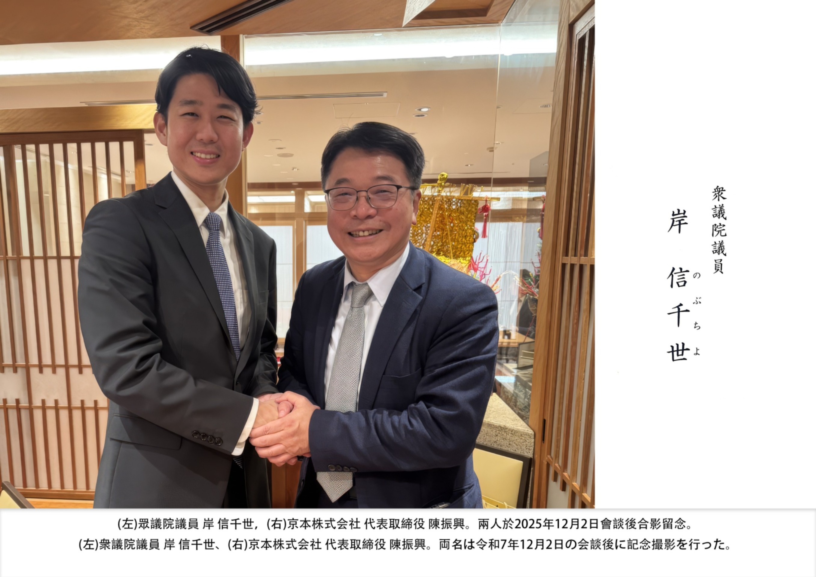 京揚株式會社(Kyoyo Co., Ltd.)社長陳振興於 12 月 2 日下午在東京拜會自民黨眾議院議員岸信千世,雙方就「Kumamoto AI Technology Arena」(熊本人工智慧科技園區,以下簡稱 KAiTA 項目)進行交流。會議深入探討了地方創生、科技供應鏈布局、AI 人才培育及國際合作等核心議題。
